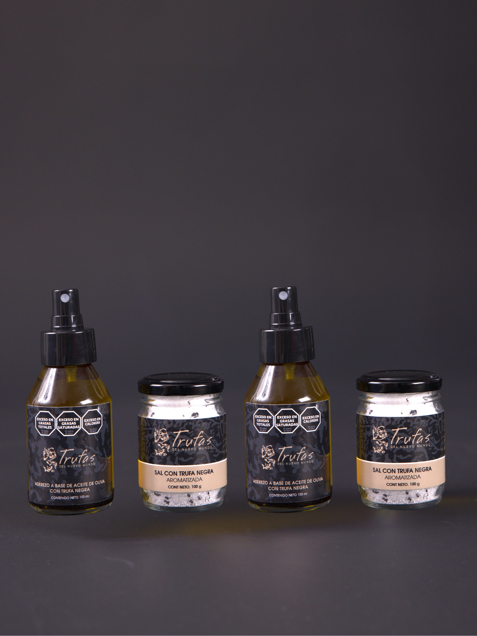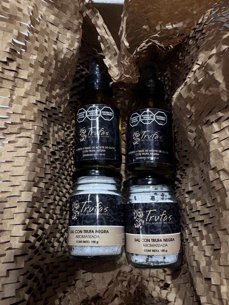 Una combinación de 2 ACEITES TRUFADOS SPRAY (100 ML) y 2 SALES TRUFADAS (100 G)